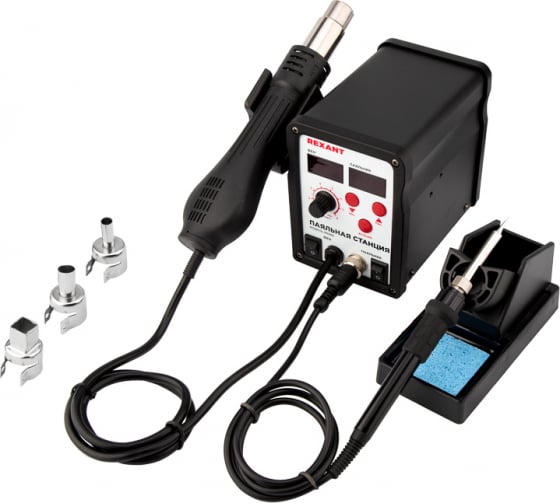 В комплектацию станции входят: основной блок, термофен, паяльник, держатель паяльника, держатель термофена, губка для очистки жала паяльника (в ложементе), а также 3 насадки для термофена 8, 10 и 13 мм.