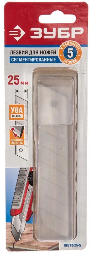 Лезвия ЗУБР "ЭКСПЕРТ" 09710-25-5 изготовлены из улучшенной инструментальной стали У8А. Они используются в ножовках для реза таких материалов, как ковровые покрытия, линолеум, гипсолитовые плиты, кровельные материалы, пластик и другие. Лезвия имеют двойную заточку и являются сегментированными. Служат очень долго. Поставляются в пластиковой упаковке. В упаковке 5 штук.