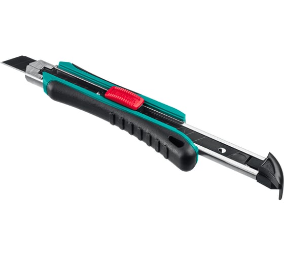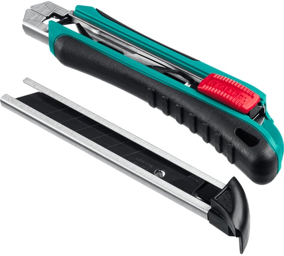 Инструмент прост в использовании - имеется надежный фиксатор и простая система отламывания лезвия. Рельефная рукоять не скользит в ладони.