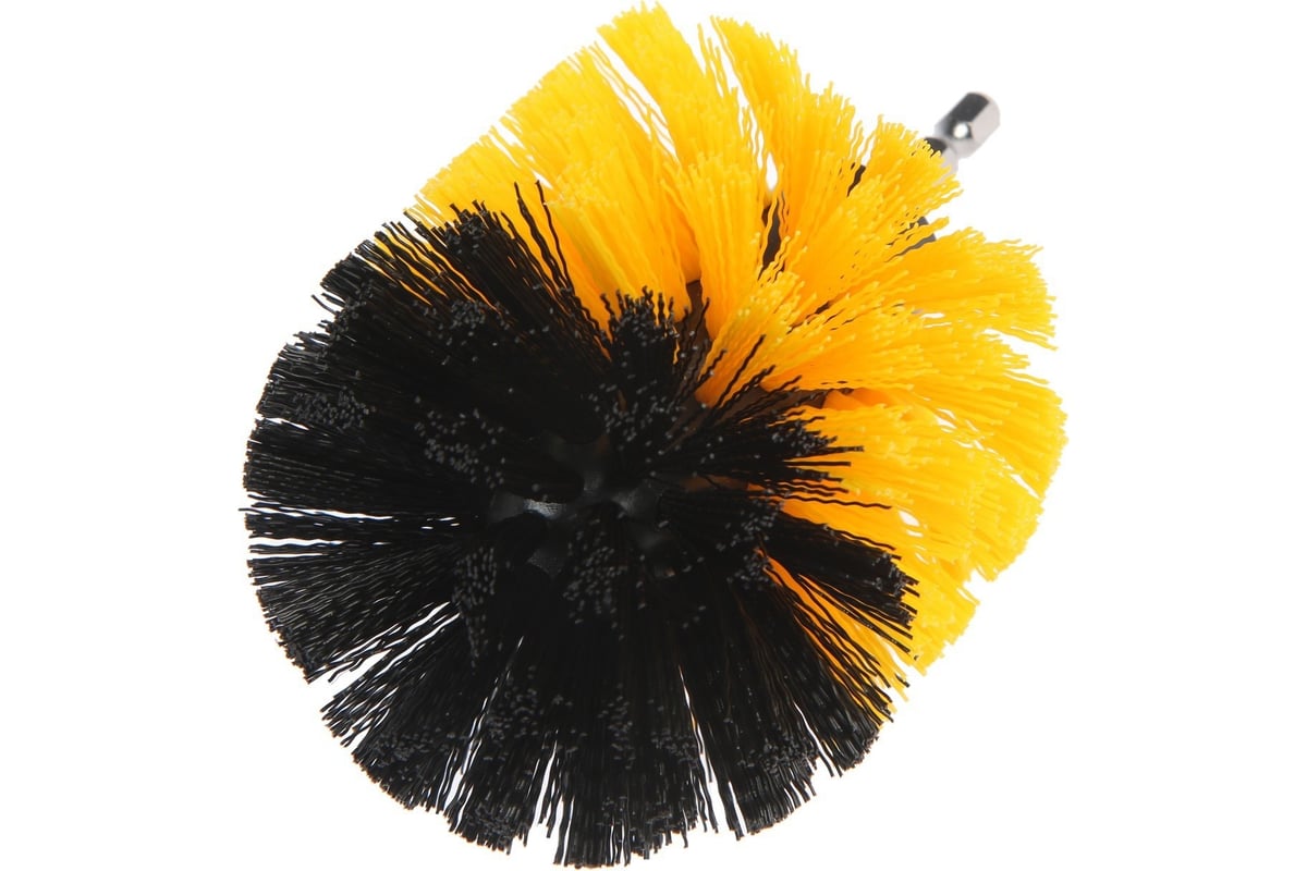 Корпус щётки выполнен из прочного пластика. Щетина выполнена из нейлона средней жёсткости. Диаметр щётки составляет 87 мм, высота 125 мм. Шестигранный хвостовик надёжно фиксируется в патроне инструмента.