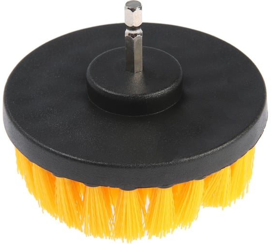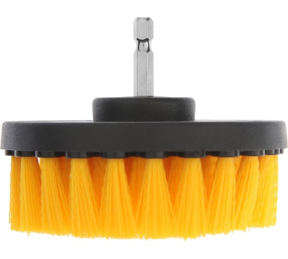 Корпус щётки выполнен из прочного пластика. Щетина выполнена из нейлона средней жёсткости. Диаметр щётки составляет 100 мм, высота 25 мм. Шестигранный хвостовик надёжно фиксируется в патроне инструмента.