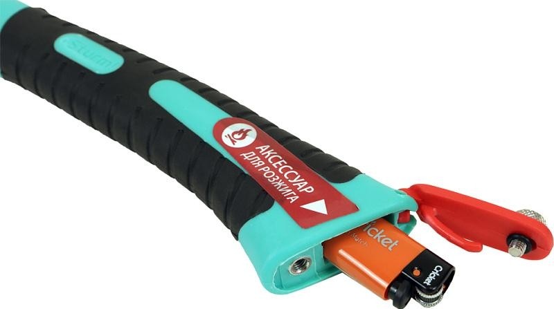 Для удобства разжигания костра в рукоятка инструмента предусмотрено место для хранения зажигалки.