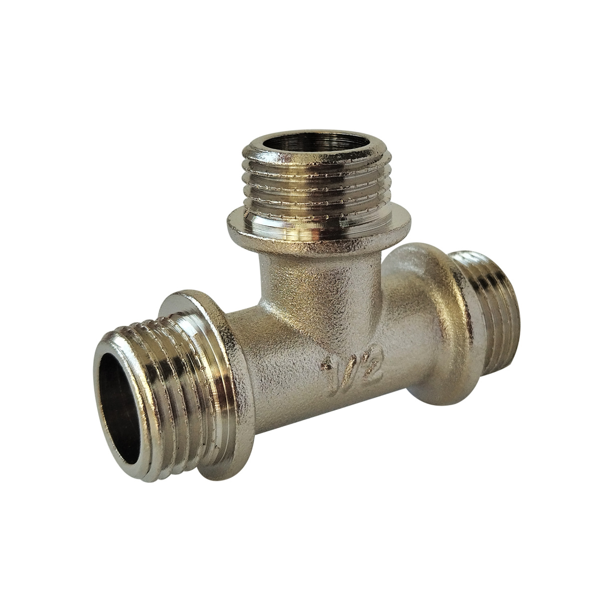 Тройник трёхсторонний резьбовой фитинг. Предназначается для соединения частей трубопровода. Тройник изготавливается из высококачественной горячепрессованной латуни. Никелированное покрытие тройника даёт дополнительный запас прочности. Никелирование предотвращает появление коррозии, а также защищает от механического износа и вредного воздействия агрессивных жидкостей и воздушно-газовых сред.
