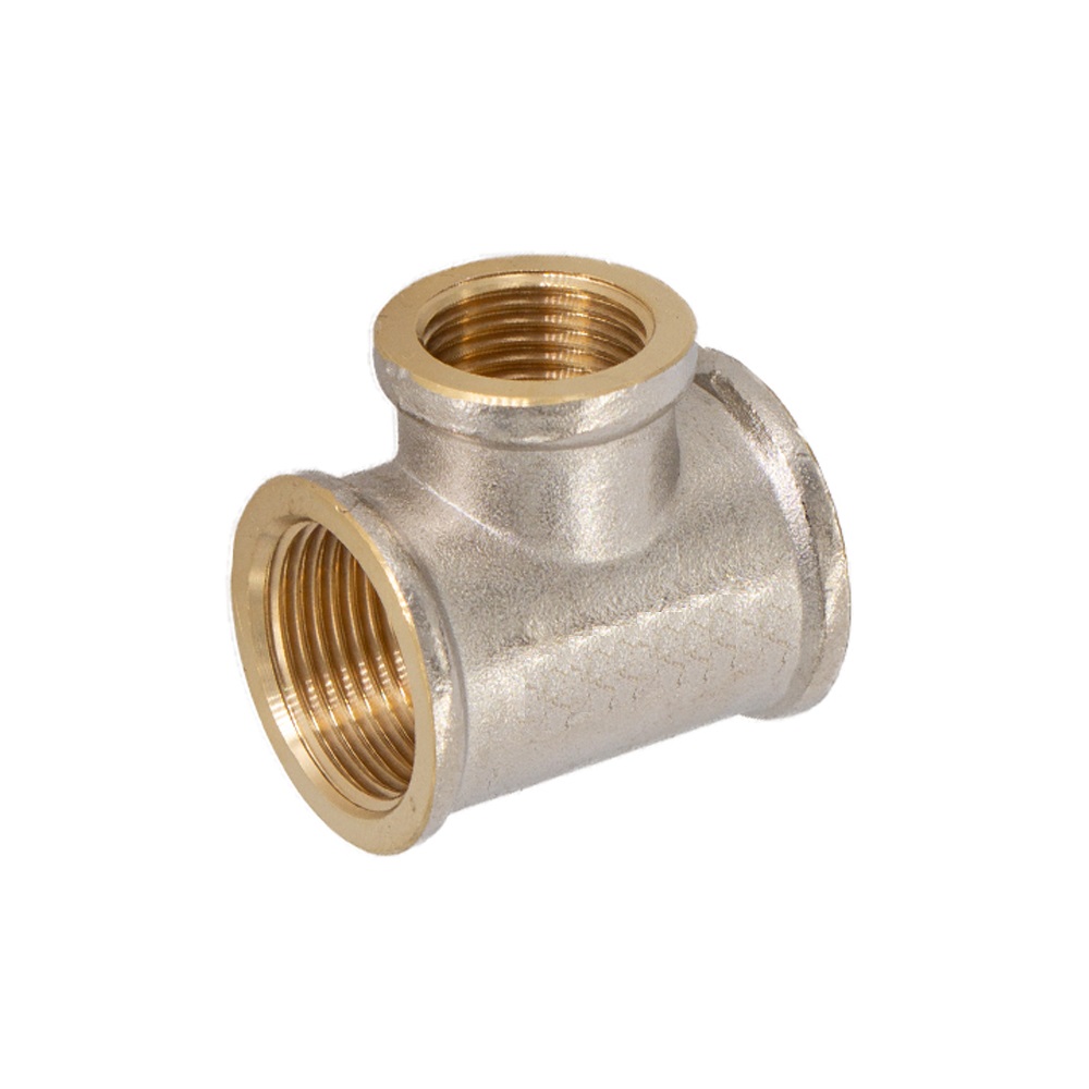 Тройник трёхсторонний резьбовой фитинг. Предназначается для соединения частей трубопровода. Тройник изготавливается из высококачественной горячепрессованной латуни. Никелированное покрытие тройника даёт дополнительный запас прочности. Никелирование предотвращает появление коррозии, а также защищает от механического износа и вредного воздействия агрессивных жидкостей и воздушно-газовых сред.