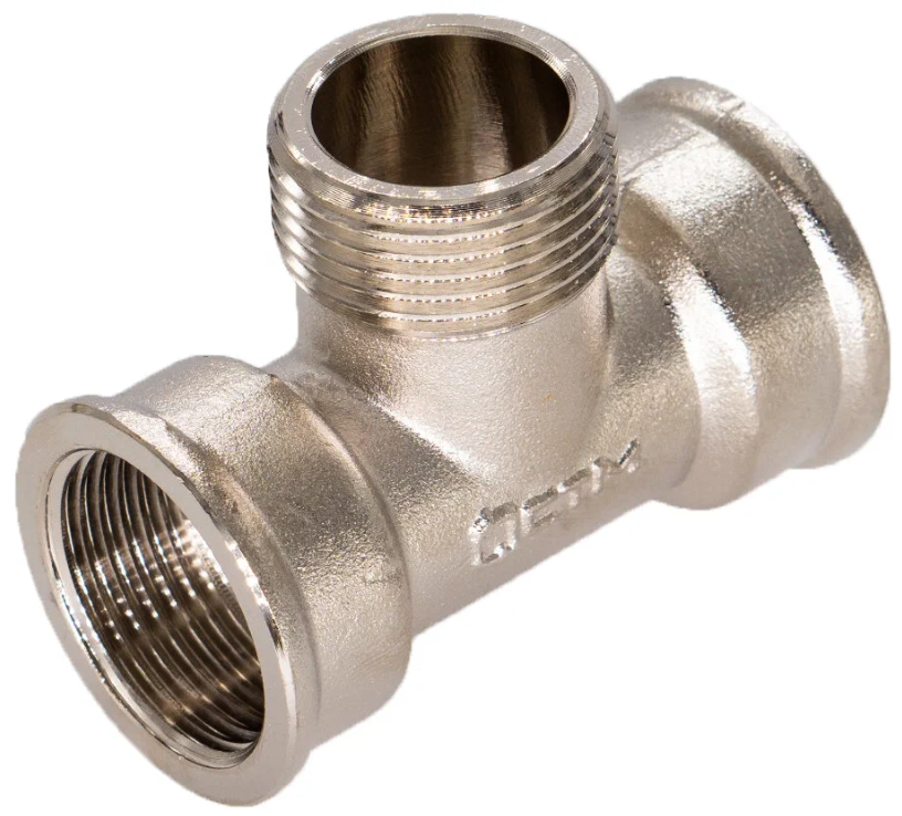 Тройник трёхсторонний резьбовой фитинг. Предназначается для соединения частей трубопровода. Тройник изготавливается из высококачественной горячепрессованной латуни. Никелированное покрытие тройника даёт дополнительный запас прочности. Никелирование предотвращает появление коррозии, а также защищает от механического износа и вредного воздействия агрессивных жидкостей и воздушно-газовых сред.