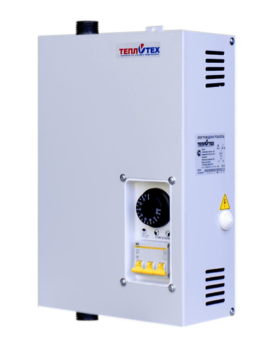 Электрический котел Теплотех ЭВП-6М состоит из корпуса, внутри которого находиться котел в виде трубы с входным и выходным патрубками. В нижней части котла установлен электронагреватель, соединенный со схемой управления. Управление водонагревателями ЭВП-3М, ЭВП-4.5М, ЭВП-6М, ЭВП- 9М, ЭВП-12М представляет собой три выключателя, которые позволяют изменять мощность котла пропорционально 1/3 мощности, 2/3 мощности и 100% мощности соответственно. Сигнализация осуществляется подсветкой выключателей 1/3 мощности – первый выключатель, 2/3 мощности – второй выключатель, 100 % мощности – первый и второй выключатели. Третий выключатель служит для управления циркуляционным насосом. Температура теплоносителя регулируется термостатом с диапазоном регулирования 0…85°С. Термовыключатель является устройством защиты водонагревателя от перегрева, которое отключает водонагреватель при превышении температуры теплоносителя свыше 90С. Возврат водонагревателя в рабочее состояние произойдет после остывания автоматически. Также, существует возможность регулирования температуры теплоносителя с помощью выносного терморегулятора (в комплект не входит). Верхний и нижний патрубки предназначены для встраивания водонагревателя в систему отопления. На боковой части корпуса имеется отверстие для ввода кабеля и заземления.