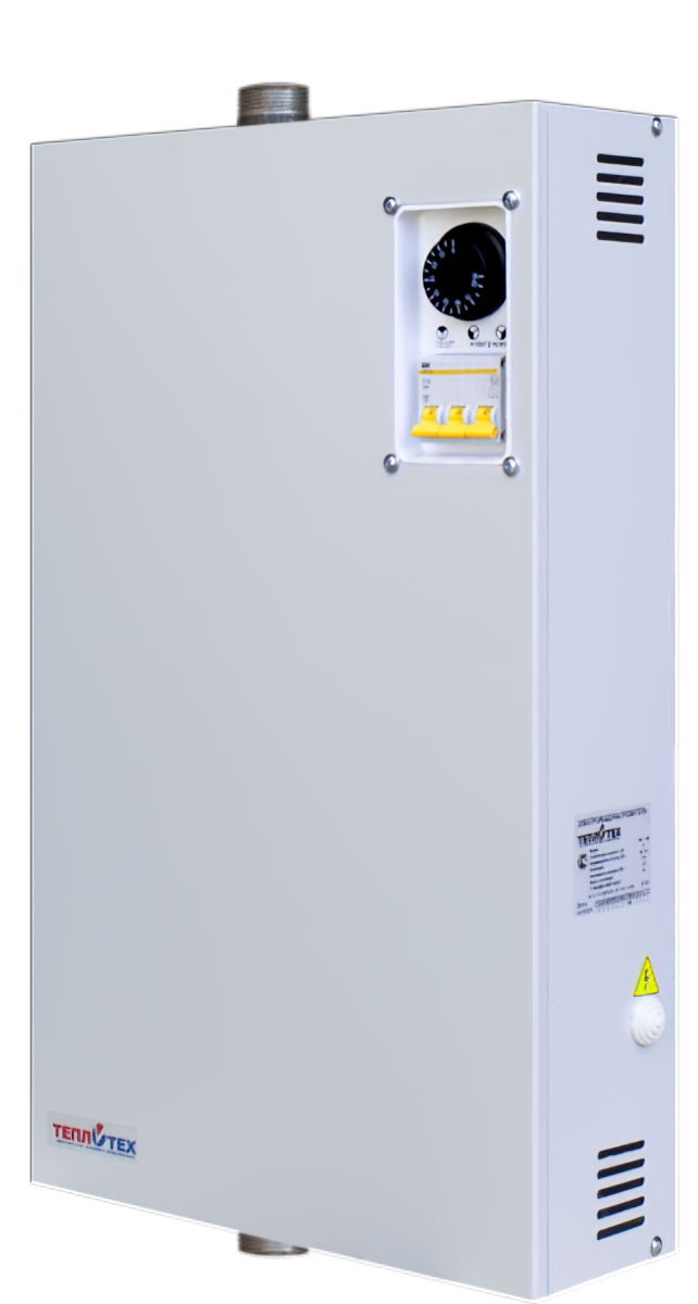 Электрический котел Теплотех ЭВП-36М состоит из корпуса, внутри которого находиться котел в виде трубы с входным и выходным патрубками. В нижней части котла установлен электронагреватель, соединенный со схемой управления. Управление водонагревателями ЭВП-3М, ЭВП-4.5М, ЭВП-6М, ЭВП- 9М, ЭВП-12М представляет собой три выключателя, которые позволяют изменять мощность котла пропорционально 1/3 мощности, 2/3 мощности и 100% мощности соответственно. Сигнализация осуществляется подсветкой выключателей 1/3 мощности – первый выключатель, 2/3 мощности – второй выключатель, 100 % мощности – первый и второй выключатели. Третий выключатель служит для управления циркуляционным насосом. Температура теплоносителя регулируется термостатом с диапазоном регулирования 0…85°С. Термовыключатель является устройством защиты водонагревателя от перегрева, которое отключает водонагреватель при превышении температуры теплоносителя свыше 90С. Возврат водонагревателя в рабочее состояние произойдет после остывания автоматически. Также, существует возможность регулирования температуры теплоносителя с помощью выносного терморегулятора (в комплект не входит). Верхний и нижний патрубки предназначены для встраивания водонагревателя в систему отопления. На боковой части корпуса имеется отверстие для ввода кабеля и заземления.