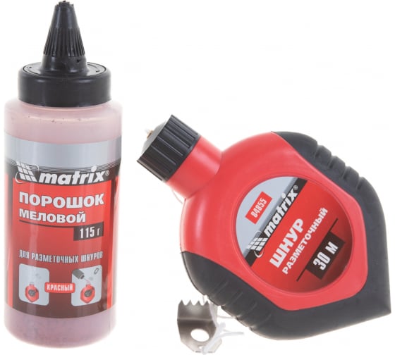 Разметочный шнур Matrix 84855 в пластмассовом обрезиненном корпусе, поставляется с красным порошком и используется для построения прямых разметочных линий на горизонтальных и вертикальных поверхностях. Используется во время проведения строительных и ремонтно-отделочных работ.